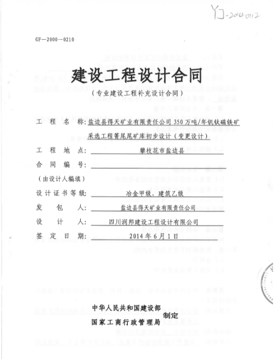 鹽邊縣得天礦業有限責任公司350萬噸每年釩鈦磁鐵礦采選工程箐尾尾礦庫初步設計(變更設計)