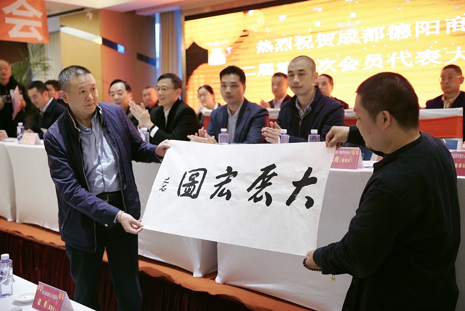 大會尾聲,書法家周運剛贈送“大展宏圖”書法作品一幅,表示祝賀。成都德陽商會第二屆第一次會員代表大會在熱烈的掌聲中圓滿閉幕!